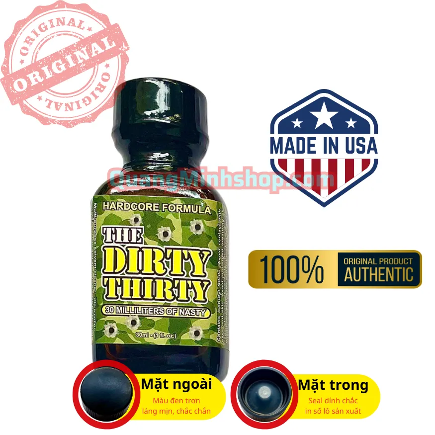 Popper Dirty Thirty 30ml USA là dòng sản phẩm thuộc phân khúc High-End (cao cấp) được sản xuất bởi Diantresolutions danh tiếng của Mỹ. Đúng như tên gọi “Dirty Thirty”, sản phẩm mang đến một sức mạnh hoang dại, rõ lực và đầy kịch tính, giúp phá bỏ mọi giới hạn của cảm xúc. Với công thức tinh chế nồng độ cao nhưng cực kỳ sạch, Dirty Thirty 30ml là “vũ khí” tối thượng dành cho những ai khao khát một cuộc yêu mãnh liệt, cuồng nhiệt và đậm chất chơi. Tại Quang Minh Shop, chúng tôi cam kết hàng chính hãng 100% (đền tiền 300% nếu phát hiện hàng giả), bảo mật thông tin và giao hàng kín đáo tuyệt đối.